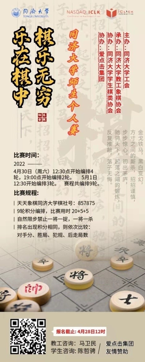 4月30日至5月1日,由校工会主办,同济大学教工象棋协会承办,学生棋类协会和iClick爱点击集团公司协办的2022年同济大学“爱点击杯”师生象棋网络个人赛在天天象棋同济大学棋社举行。
