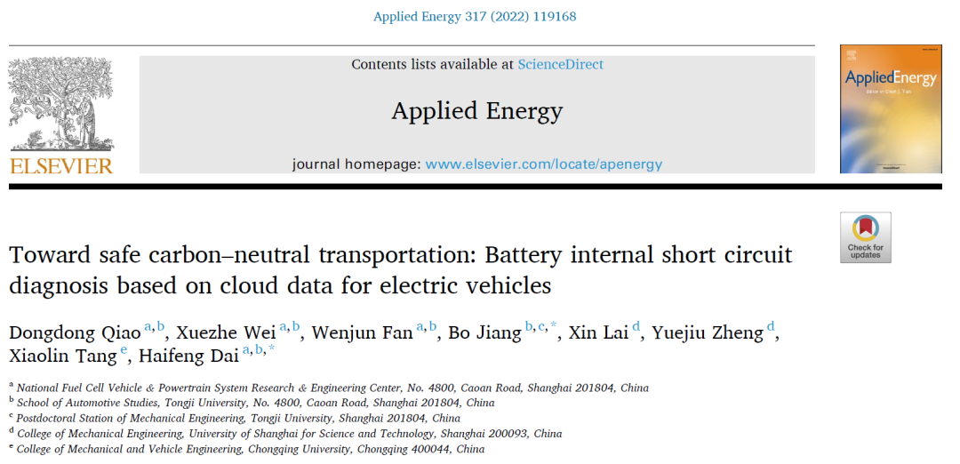 近日,汽车学院魏学哲教授团队在动力电池安全领域研究取得进展,相关成果“Toward safe carbon–neutral transportation: Battery internal short circuit diagnosis based on cloud data for electric vehicles”在线发表于Applied Energy。