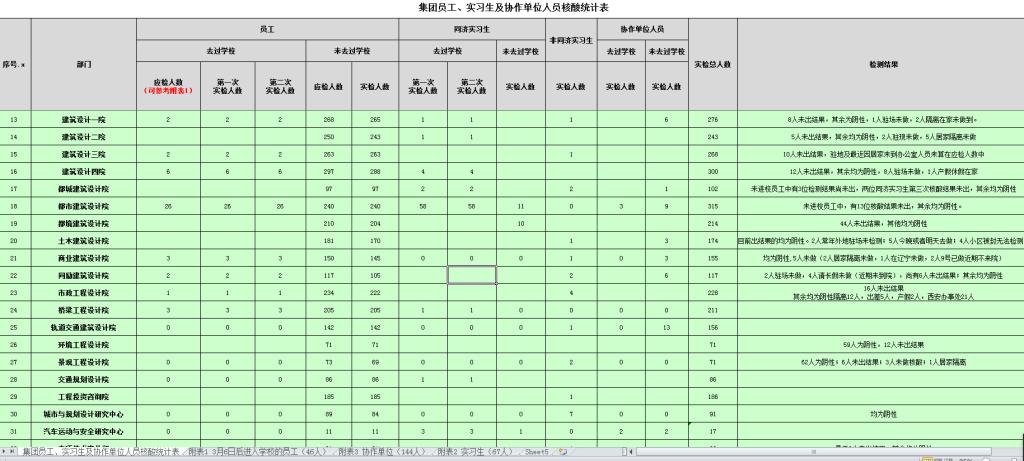 此轮疫情需在短时间内排摸掌握集团人员数据。设计院人数达4500余人,且办公场所分散、人员性质不同,人员构成极其复杂。在摸清人员底数的同时,集团对人员实施分类化精准管理,按优先级划分并管理不同人群,包括教职工、员工、实习生、协作单位人员、居住公司公寓员工等,并按人员流动情况实施动态更新。3月9日晚起至3月12日是学校人员底数摸清工作最重要的关键时间段,工作任务时间紧,工作人员不断跟部门确认、沟通,一对一核对,确保掌握每一位进校、留校人员的具体情况,做到“底数清、情况明”。及时排摸员工核酸检测情况,尤其为3月6日及以后进入四平路校区的61名员工,制定专人定时提醒做好5次核酸检测,并做好记录。