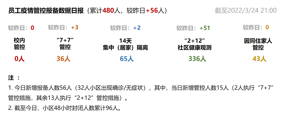 集团各部门通力合作,做好员工管理与后勤保障。利用集团各处屏幕及企业微信向全员发布紧急通知、滚动播报最新工作进展,做好解释和员工安抚工作。全方位进行人员排摸,包括在院员工、来访人员、协作单位、实习生、物业食堂人员等,以及特殊情况人员(孕妇、生病、双职工、急需用药等),尤其是3月6日以来进校人员,逐一排查确认。协调场地和人员,做好全员核酸检测的准备。做好后勤保障,号召人员错峰就餐。立即协调和落实口罩、防护服、洗漱用品、床品等防疫和生活物资,确保楼内人员基本需求。根据学校指示,当晚发布解除集团大楼的原地待命通知,楼内人员分批有序撤离,奔向等待已久的家人。之后,集团也根据疫情形势和上级通知,及时召开会议部署工作,并根据疫情形势动态调整管控措施,做好疫情防控统筹安排工作。