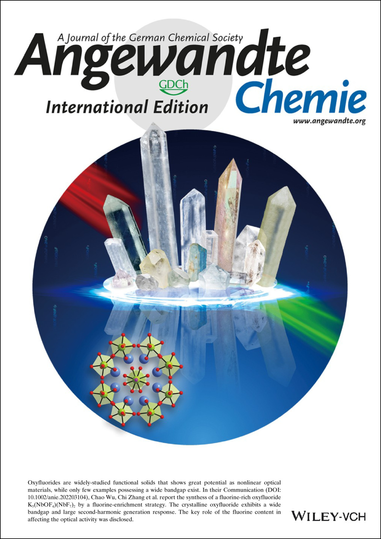 我校化学科学与工程学院张弛院士研究团队以氧氟化物为研究对象,提出了一种富集高电负性氟阴离子调控能带结构的分子设计策略,设计创制了一例具有宽带隙和强倍频响应的日盲紫外非线性光学晶体材料K5(NbOF4)(NbF7)2 (KNOF)。相关成果“Ultrawide Bandgap and Outstanding Second-Harmonic Generation Response by a Fluorine Enrichment Strategy at a Transition-Metal Oxyfluoride Nonlinear Optical Material” (过渡金属氟氧化物非线性光学材料实现了超宽能带和强的二次谐波响应)5月17日以通讯形式发表于国际化学权威学术期刊《德国应用化学》(Angew. Chem. Int. Ed., 2022, e202203104),并被Angewandte Chemie编辑委员会遴选为期刊的封面文章(Angew. Chem. Int. Ed., 2022, e202206423)。