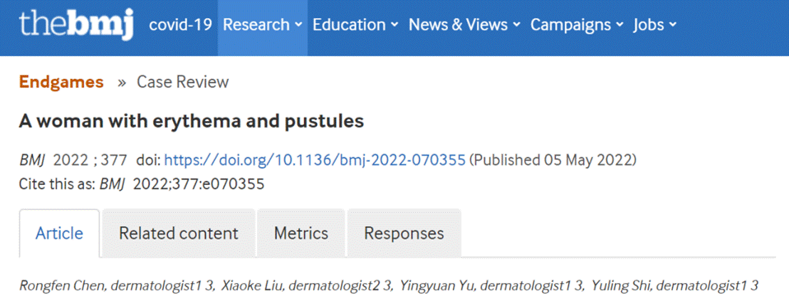 近日,同济大学医学院、附属皮肤病医院史玉玲教授团队在国际著名综合性医学期刊《英国医学杂志》(British Medical Journal,简称“BMJ”)上发表了题为“A woman with erythema and pustules”的病例报告。本文的通讯作者为史玉玲教授,第一作者是陈荣芬医生。