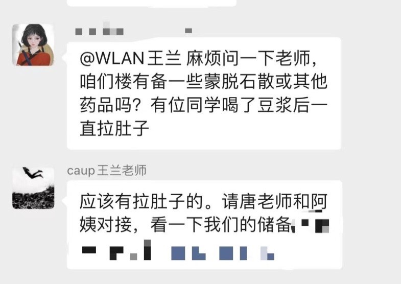 王兰提出在每个宿舍楼值班室内储备一些常规药,以供学生不时之需,这一点极有效地缓解了学生们的燃眉之急。封控期间,宿舍楼内有同学出现腹泻的情况,备用药的存在有效快速地解决了同学们的需求。