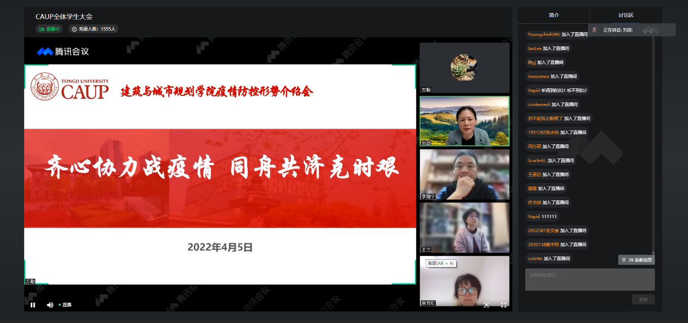 自学校进入封闭管理以来,李翔宁院长与刘颂书记一起组织召开线上、线下各类师生大会、座谈会20余场。学校准封闭初期带领在校班子成员走进学生社区开展线下座谈,送去温暖与关怀。多次与全院1700多名学生直播连线,直面评论区学生各类诉求,积极回应,他率真的个性赢得了学生的信任,先后添加500余位学生微信,每天回复数百条学生及家长的问题,耐心细致,逐一解决学生的急难愁盼。稳步推进学院各项日常工作,组织召开同济大学第七届国际青年学者论坛“建筑学、城乡规划学、风景园林学分论坛”,举办我国首个城市设计本科专业线上研讨会,布局学院一流学科群建设,筹划70周年院庆各项安排,推进学科史撰写和出版等,有条不紊,齐头并进。