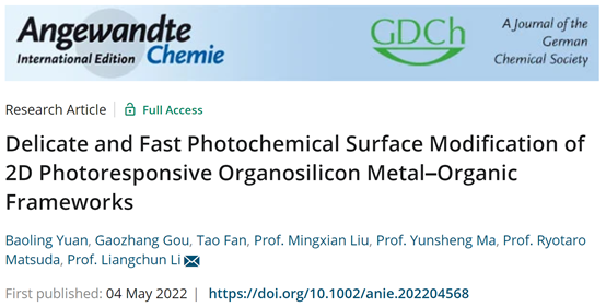 我校化学科学与工程学院李良春教授课题组致力于把有机硅与MOFs材料相融合,开展交叉研究。近日,该课题组的相关研究成果以“Delicate and Fast Photochemical Surface Modification of 2D Photoresponsive Organosilicon Metal–Organic Frameworks”为题,发表在国际知名期刊《德国应用化学》(Angewandte Chemie International Edition)上。