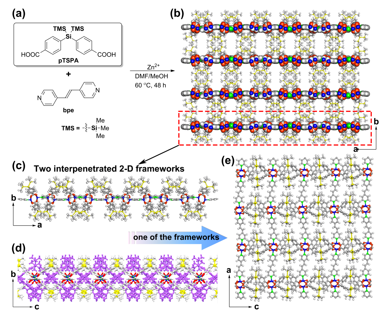 基于以上考虑,研究人员首先设计合成了基于SiTMS2的二羧酸有机硅化合物pTSPA,采用溶剂热法利用pTSPA、bpe与Zn盐结合合成了具有二维层状结构的TSiMOF,单晶结构解析证实了SiTMS2基团规整地排列在二维层状结构的表面。二维层由二重穿插的配位网络结构组成因而具有较高的稳定性,二维层与层之间由具有弱范德华力的TMS基团面对面堆砌形成一维的孔道。弱作用力使得此材料可以通过剥层制备新型的TSiMOF微纳米片,暴露更多的光响应基团。