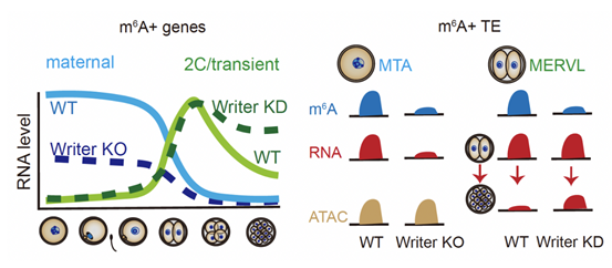 高绍荣介绍,团队利用高通量测序法首次绘制了小鼠早期胚胎发育过程中转录本上m6A修饰的动态图谱,并证实了母源的转座子MTA2-细胞时期转座子MERVL具有高度的m6A修饰富集。研究进一步发现m6A修饰分别维持了卵母细胞中母源RNA的稳定性,以及受精后短暂表达的转录本的及时降解。m6A修饰在卵母细胞和合子基因激活阶段不同的调控功能体现了生命初始阶段调控的复杂性,并为进一步探究生命调控奥秘开辟了全新视域。