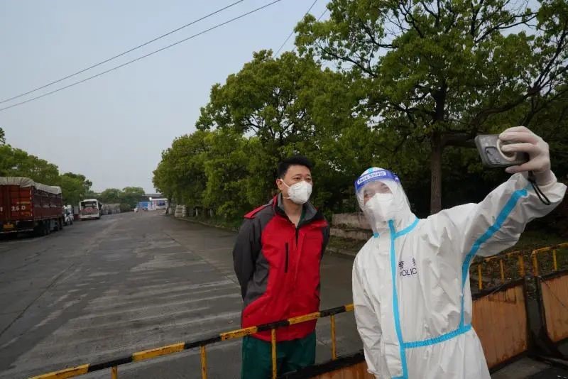 4月21日6时50分,金山天华路方舱医院门口,刚刚走下班车准备进舱上班的附属同济医院医疗队队员、急诊抢救室护士长刘建,疾步走向一位站在执勤警车前、胸前贴着警察标识的“大白”,一见面他们互相唏嘘:“你一点没变化嘛!这么多年一直在锻炼、身材保持的不错嘛,退伍不褪色!” “很想拥抱一下!可惜现在还不是时候……”“大白”是刘建十年前一起退伍的战友加好友、金山区公安局民警汤佳斌,而这次重聚距离上次相逢整整间隔了十年。