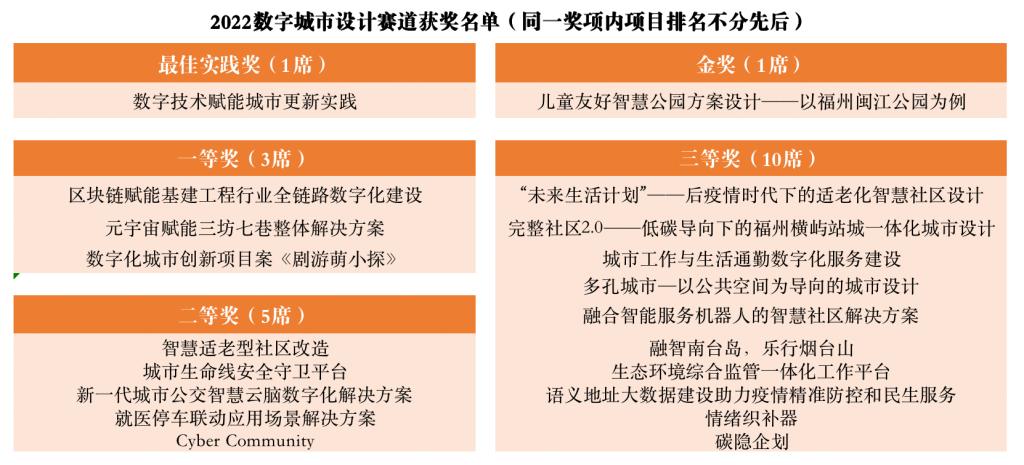 作为第五届数字中国建设峰会的重要组成部分,数字城市设计赛道总决赛由同济大学、世界规划教育组织(WUPEN)、福州市勘测院有限公司和中国移动通信集团福建有限公司福州分公司共同组织。此次数字城市设计赛道共收到来自国内外的参赛方案共1883份,616家机构的6426人次同台竞技,作品范围覆盖6个国家、109座城市。大赛最终决出最佳实践奖1项、金奖1项、一等奖3项、二等奖5席和三等奖10项。