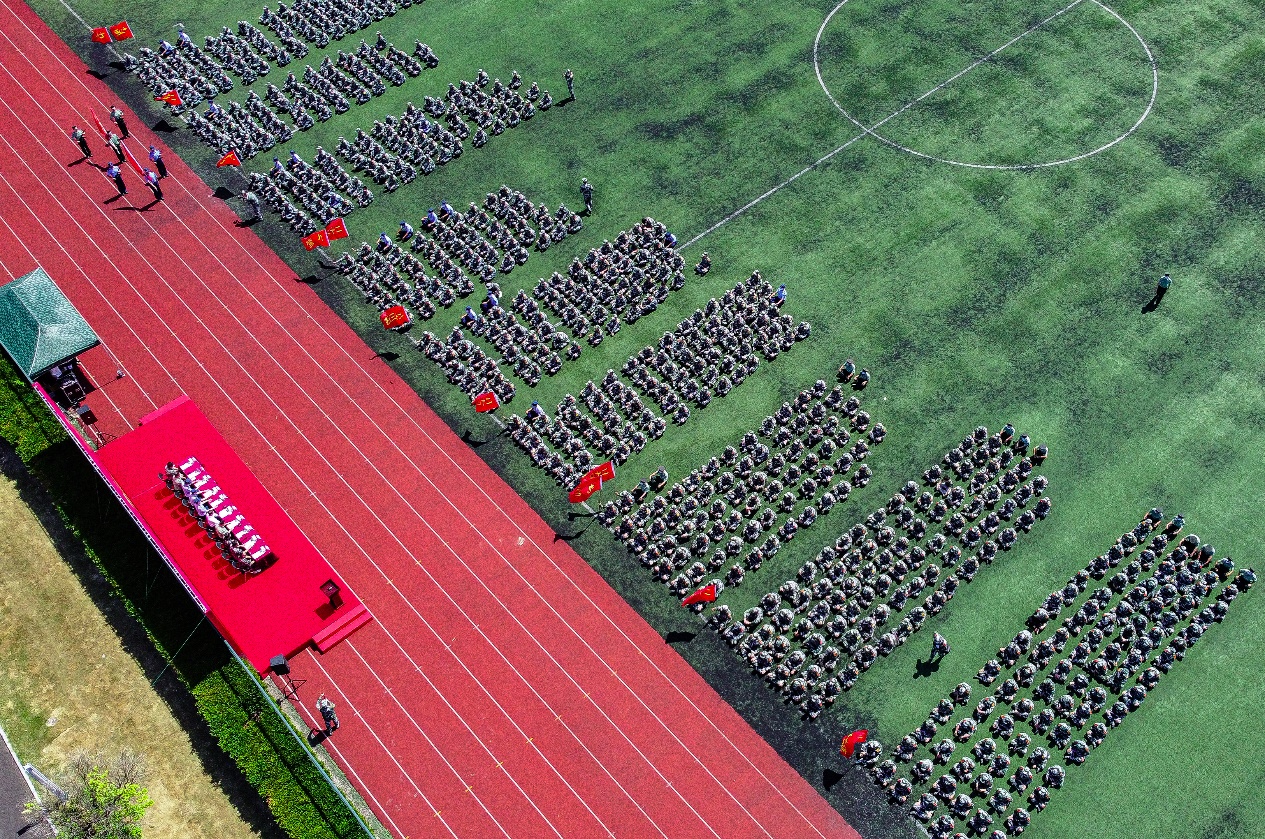 会场氛围严肃庄重,全体参训学生坐姿端正挺拔。集中军训动员大会在激昂的军歌声中圆满落幕。