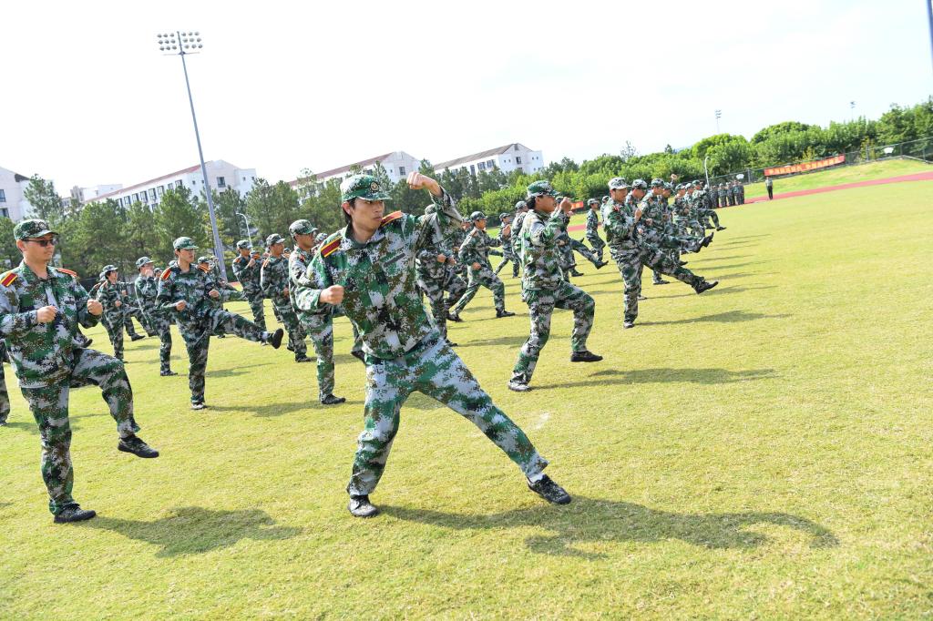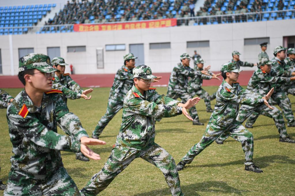 军训科目汇报表演上,汇报军体拳的同学动作训练有素,刺杀操的同学坚韧勇猛,擒敌拳的同学坚定有力,赢得了全场阵阵欢呼和掌声。