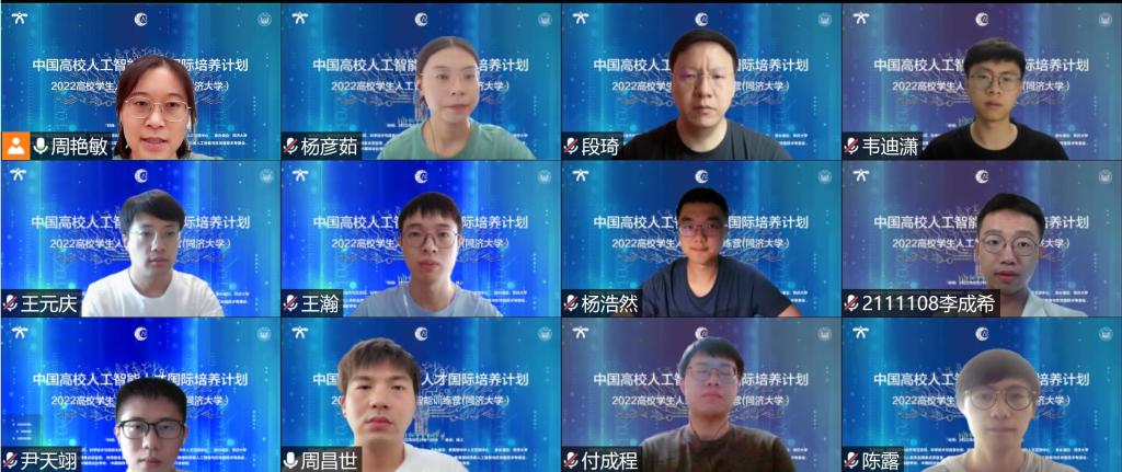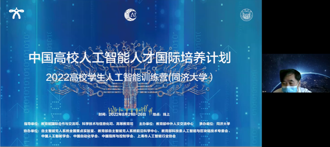 8月21日至26日,由教育部国际合作与交流司、科学技术与信息化司、高等教育司指导,教育部中外人文交流中心主办、同济大学承办,自主智能无人系统全国重点实验室、教育部自主智能无人系统前沿科学中心、教育部科技委人工智能与区块链技术专委会、中国人工智能学会、中国自动化学会、中国指挥与控制学会、上海市人工智能行业协会协办的“中国高校人工智能人才国际培养计划”2022高校学生人工智能训练营(同济大学)”在线举办。