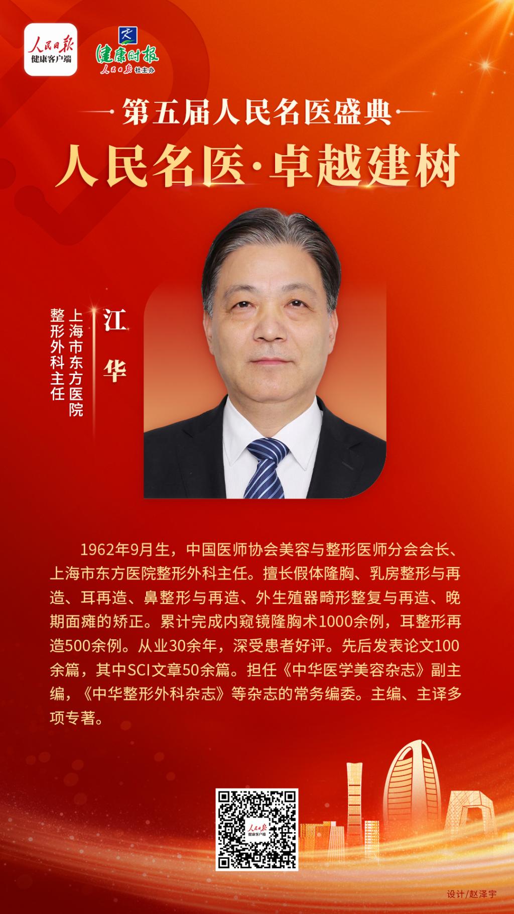 中国医师协会美容与整形医师分会会长、同济大学附属东方医院整形外科主任。擅长假体隆胸、乳房整形与再造、耳再造、鼻整形与再造、外生殖器畸形整复与再造、晚期面瘫的矫正。累计完成内窥镜隆胸术1000余例、耳整形再造1000余例。从业30余年,深受患者好评。先后发表论文100余篇,其中高水平文章50余篇。担任《中华医学美容杂志》副主编,《中华整形外科杂志》等杂志的常务编委。主编、主译多项专著。