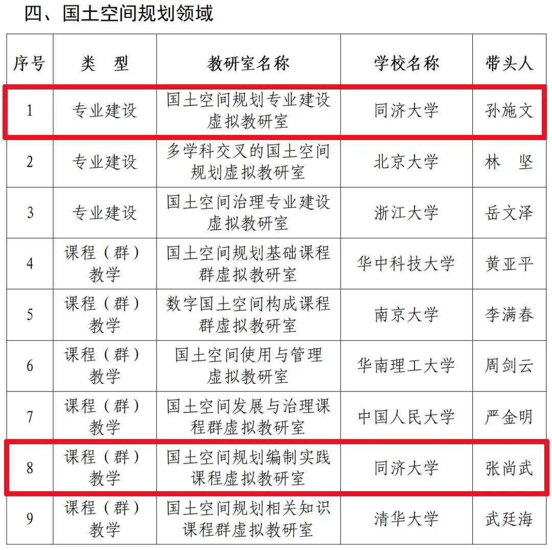 近日,重点领域教学资源建设项目管理办公室公布了首批重点领域虚拟教研室建设试点名单,共有33个虚拟教研室获批试点建设,其中人工智能领域9个、重型燃气轮机领域2个、病毒学领域8个、国土空间规划领域9个、技术研究类5个。其中,我校建筑与城市规划学院孙施文教授申报的“国土空间规划专业建设虚拟教研室”与张尚武教授申报的“国土空间规划编制实践课程虚拟教研室”被列入国土空间规划领域虚拟教研室建设试点名单中。