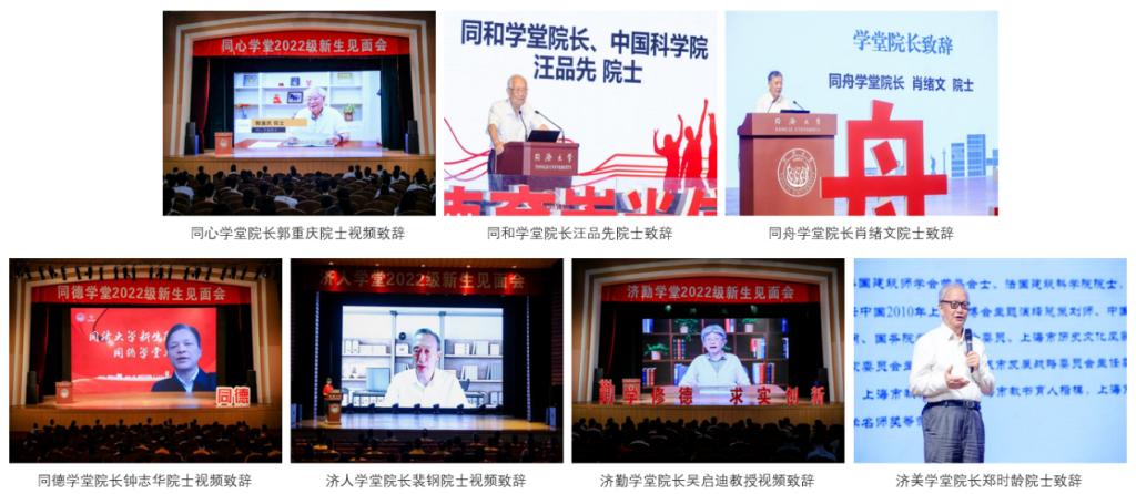 新生院自成立以来,全面推行大类招生、大类培养和大类管理联动的人才培养新体系。其中,大类管理的重中之重便是学堂管理。目前,新生院设有同心、同德、同舟、同和、济人、济世、济勤、济美八大学堂,同济大学聘请了知名专家学者担任八大学堂的院长、执行院长,来引领和统筹指导学堂的人才培养工作。同心学堂院长郭重庆院士、同和学堂院长汪品先院士、同舟学堂院长肖绪文院士、同德学堂院长钟志华院士、济人学堂院长裴钢院士、济美学堂院长郑时龄院士、济勤学堂院长吴启迪教授以及八大学堂的执行院长在见面会上聚焦前沿,以线上线下相融合方式与同学们对话成长,共话未来。