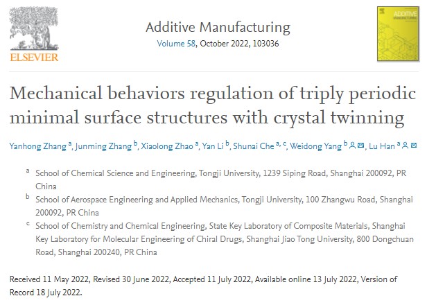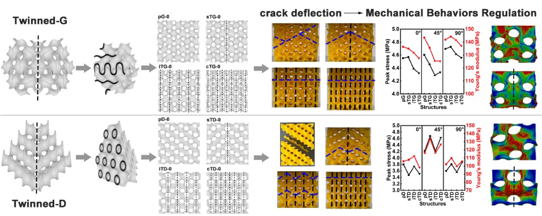 日前,我校化学科学与工程学院韩璐教授课题组和航空航天与力学学院杨伟东课题组提出了一种通过引入晶体孪晶设计来控制应力传递路径的策略,将微观晶体结构应用到宏观力学材料设计中,实现了三周期极小曲面结构的变形行为可编程,为结构的设计与保护提供了一种新思路。相关研究成果“Mechanical behaviors regulation of triply periodic minimal surface structures with crystal twinning”在线发表于《增材制造》(Additive Manufacturing)。