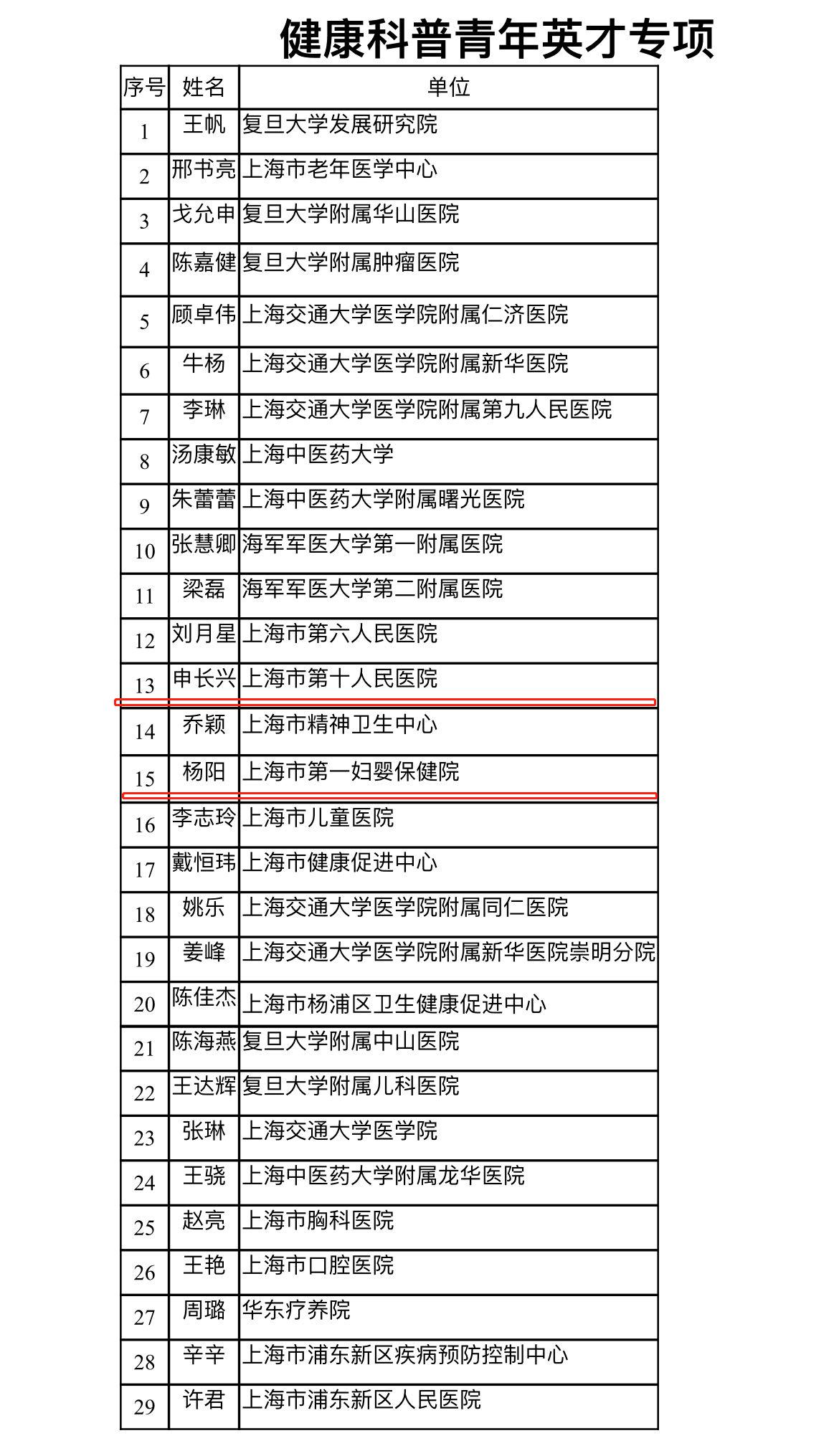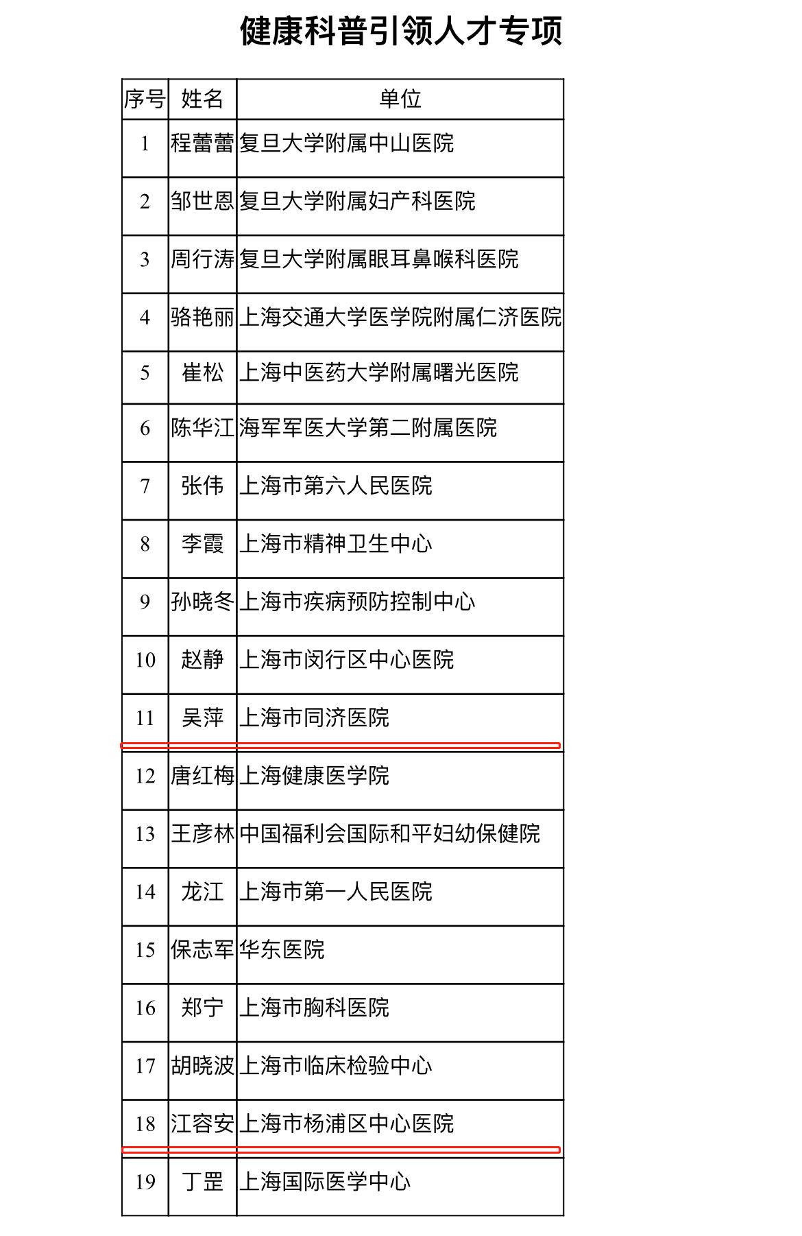 为大力培育健康科普高端人才与青年英才,上海市率先在全国推出有财政经费支持的健康科普人才能力提升专项。目前首轮上海市健康科普人才能力提升专项名单正式发布,我校附属同济医院吴萍医生、附属杨浦医院江容安医生入选健康科普引领人才专项,附属第十人民医院申长兴医生、附属第一妇婴保健院杨阳医生入选健康科普青年英才专项。