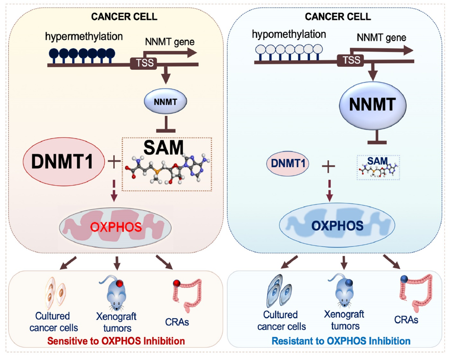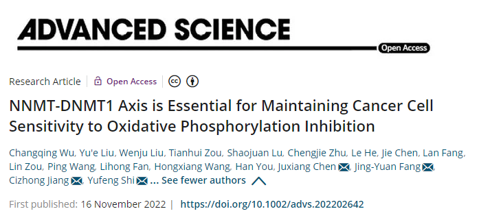 11月16日,《高级科学》(Advanced Science)Advanced Science上报道了同济大学癌症中心施裕丰团队、生科院江赐忠团队联合上海交大仁济医院房静远团队、上海长海医院陈菊祥团队合作,首次发现NNMT-DNMT1信号轴影响肿瘤细胞对线粒体氧化磷酸化抑制剂的敏感性。该研究揭示了肿瘤细胞对线粒体氧化磷酸化抑制剂敏感性和耐药的分类标签,为靶向线粒体氧化磷酸化治疗肿瘤提供了新策略。