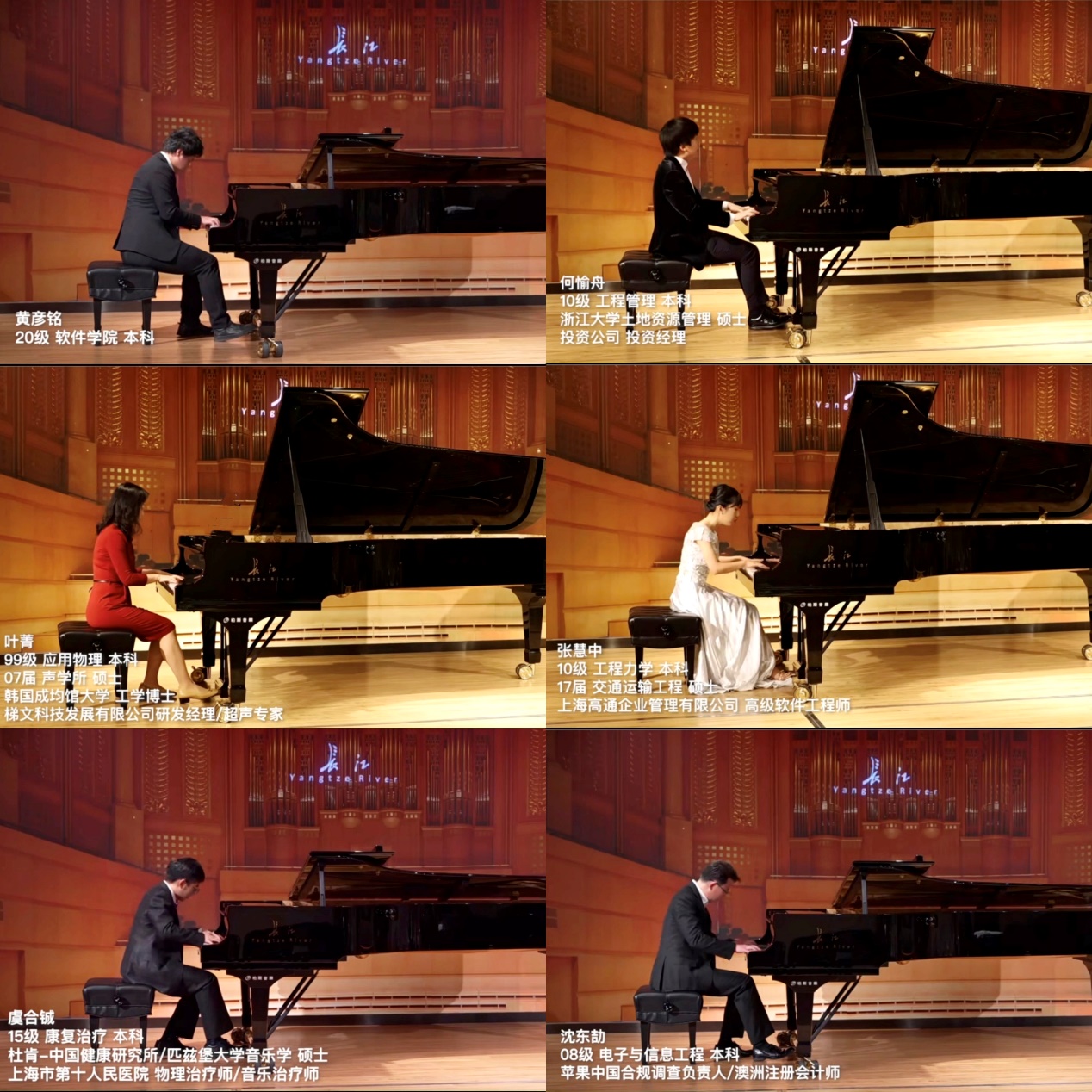音乐会的演奏者分别来自土木工程、建筑与城市规划、机械与能源工程、电子与信息工程、经济与管理、交通运输工程、人文、医学、软件、材料科学与工程、设计创意、艺术与传媒等学院。他们当中有留校任教的教授、博士生导师,有继续在国外深造的硕士、博士,更有优秀的工程师、律师、企业高管、领域专家、医生、钢琴教师等。大家在繁忙的工作学习之余相聚在一起,以精彩的演出表达了对母校的思念与对钢琴协会的美好祝福。