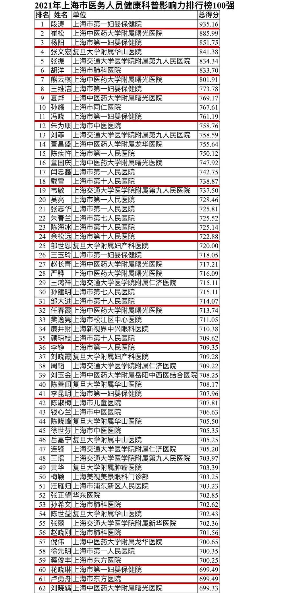 11月24日,上海市医疗机构和医务人员健康科普影响力排行榜发布。同济大学附属第一妇婴保健院、附属第十人民医院、附属东方医院、附属上海市肺科医院、附属同济医院、附属上海市第四人民医院入围“医疗机构健康科普影响力排行榜50强”,24位同医人入围“医务人员健康科普影响力排行榜100强”。