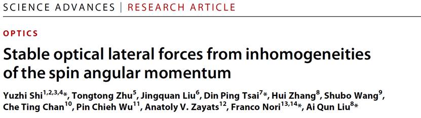 物理科学与工程学院施宇智特聘研究员在光自旋角动量引起的横向力的研究上取得进展,相关成果发表于Science Advances