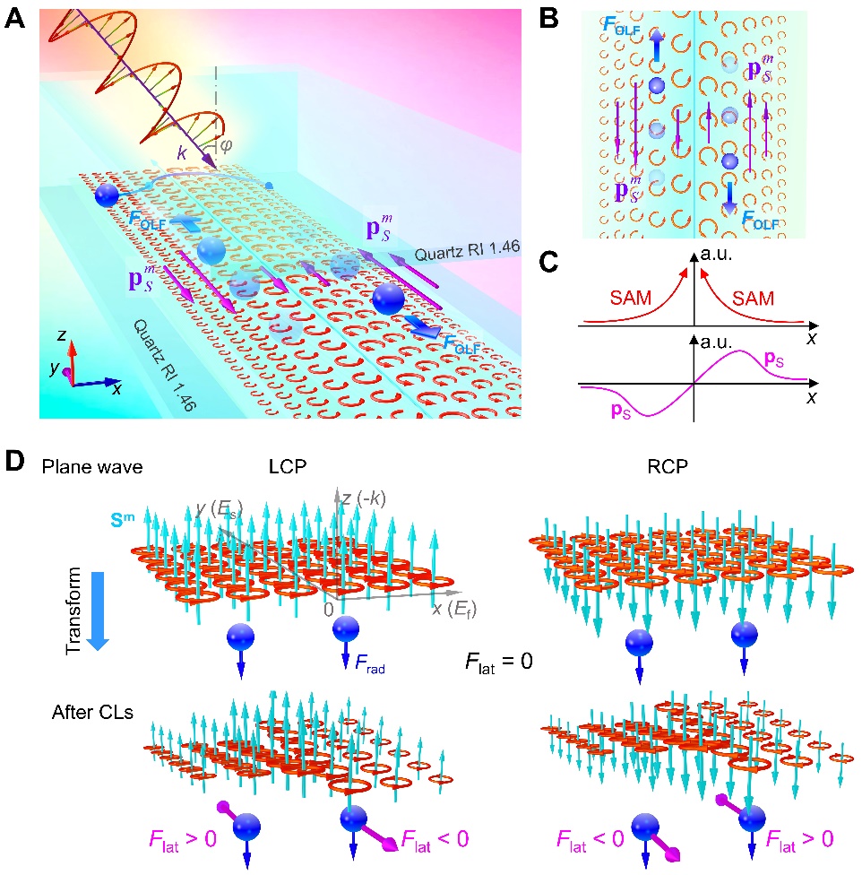 研究表明,在单一松散汇聚的现状光束中,自旋角动量(SAM)的不均匀可以产生横向自旋动量(自旋角动量的旋度)。而颗粒在电偶极子和磁偶极子的相互作用下可以产生平行于横向自旋动量的光横向力。同时,理论预测下不同材质的颗粒如金属球和介电质球等由于极化率的不同会产生方向相反的光横向力。此外,由于光中轴线两侧自旋角动量的梯度方向相反,相应产生的横向自旋动量的方向也相反,从而产生方向相反的光横向力,如图1B-1D所示。