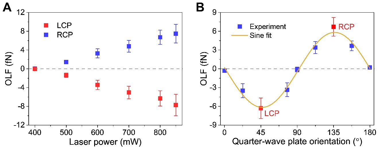该团队还巧妙地设计了实验来观察光横向力,如图3所示。为了消除界面导致的自旋-轨道角动量的耦合对光横向力的影响,采用了周围介质折射率匹配衬底折射率的方式,构造了介电常数均一的环境。实验结果表明,直径5微米的粒子在具有相反自旋动量的光束两侧沿着相反的方向运动,而对于左旋和右旋偏振的光场,粒子运动方向同样相反。光力定量测量表明,光横向力的大小与激光功率呈线性关系,且存在使颗粒运动的最小激光能量以产生光横向力克服摩擦力和惯性的作用,如图4所示。如图4B所示,光横向力的大小和方向与光场偏振具有sine函数关系,这与理论预测结果(图2D)相符。