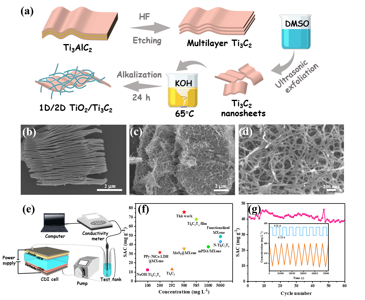 近日,环境科学与工程学院马杰教授团队在Advanced Science上发表了题为“Ti3C2-MXene Partially Derived Hierarchical 1D/2D TiO2/Ti3C2 Heterostructure Electrode for High-Performance Capacitive Deionization”的学术论文,报道了一种利用原位碱处理构建部分衍生的MXene脱盐电极(1D/2D TiO2/Ti3C2)的新策略。TiO2/Ti3C2电极具有独特的三明治夹层分级结构和赝电容效应,展现出高效的脱盐容量和循环稳定性,此研究对构建具有优异电容去离子性能的MXene基赝电容电极材料具有重要意义。