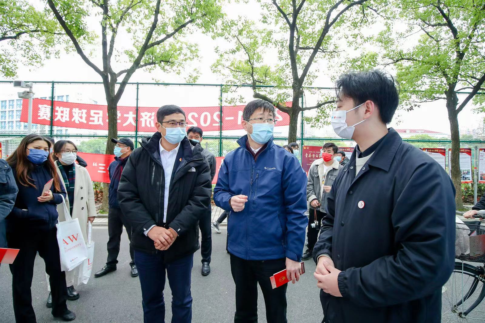 在四平路校区南大道,彭震伟来到活动现场,饶有兴趣地学习宪法知识,讨论学校普法工作与学生权益保障工作,并与学生亲切互动,勉励在场师生认真学习党的二十大精神,开展好常态化普法宣传,引导师生树立法治思维,并叮嘱各级学生会组织要在团委指导下,更好地发挥学校联系青年学生的桥梁和纽带作用。