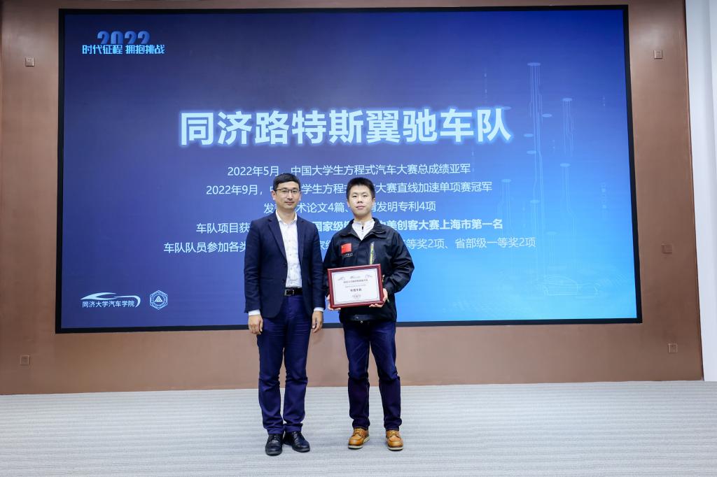 会议为2022年汽车学院年度车队——同济大学路特斯翼驰车队颁发证书,为2022年同车行创新人才培育计划导师颁发聘书。