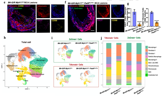 为了进一步明确血管平滑肌细胞来源巨噬细胞外捕捉对斑块进展的影响,研究者构建了三基因敲除小鼠(Myh11Cre/B6G/Pad4flox/flox)并制成动脉粥样硬化模型,通过流式分选Tdtomato+的血管平滑肌细胞结合单细胞测序技术,首次探讨了体内抑制血管平滑肌细胞产生细胞外捕捉通过改变血管平滑肌细胞命运重编程方向,从而影响动脉粥样硬化不稳定性和斑块进展。进一步提示了血管平滑肌细胞来源巨噬细胞产生细胞外捕捉对于改变斑块内微环境具有重要作用(图2)。