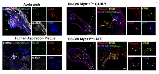 该研究采用血管平滑肌细胞谱系示踪小鼠(Myh11-cre/ERT2/B6/JGpt-H11em1Cin(CAG-LoxP-ZsGreen-Stop-LoxP-tdTomato)/Gp,简称 Myh11Cre/B6G)结合PCSK9-AAV鼠尾静脉注射联合高脂饲料喂养进行动脉粥样硬化疾病造模,首次证明在晚期斑块中,血管平滑肌细胞转分化而来的巨噬细胞是细胞外捕捉的重要来源(图1)。