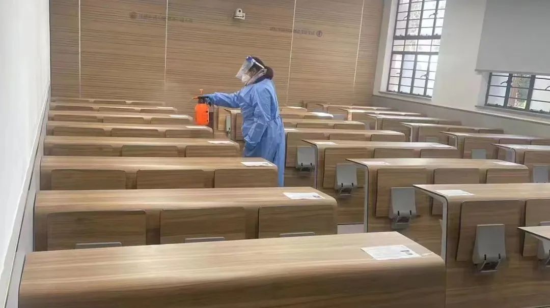 考前,学校安排校外专业消杀公司对考场进行整体消杀。在考试当天早上、每场考试后及考试结束后安排物业工作人员对所有考场、卫生间及公共部位进行全面消杀。