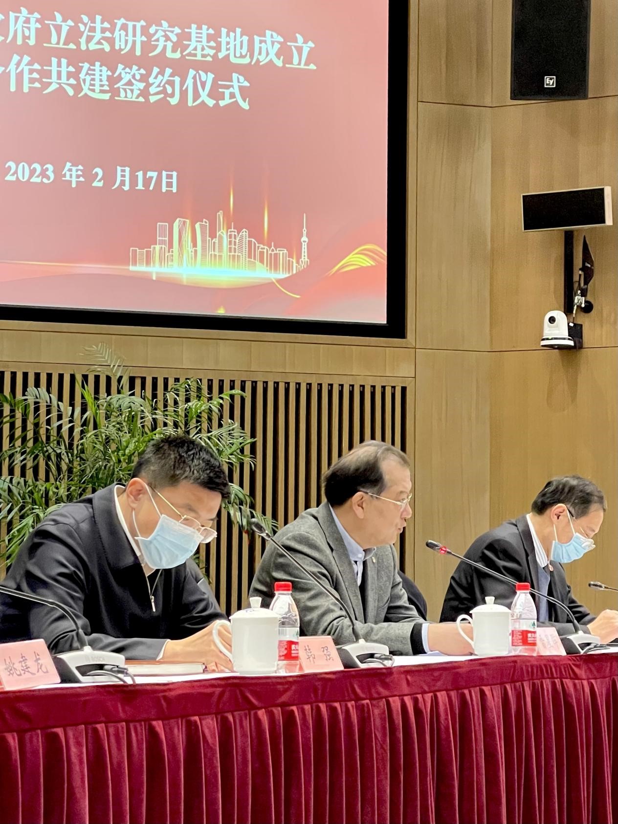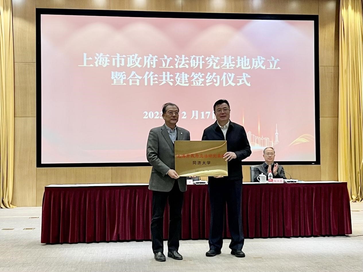2月17日,上海市司法局举行上海市政府立法研究基地成立暨合作共建签约仪式。上海市政府党组成员舒庆为基地共建单位授牌并发表重要讲话。上海市司法局局长陆卫东与复旦大学、上海交通大学、同济大学、华东师范大学、华东政法大学、上海政法学院、上海社会科学院法学研究所等7所高校(所)分别签署《上海市政府立法研究基地合作共建协议》。我校副校长雷星晖代表同济大学在会上作交流发言。