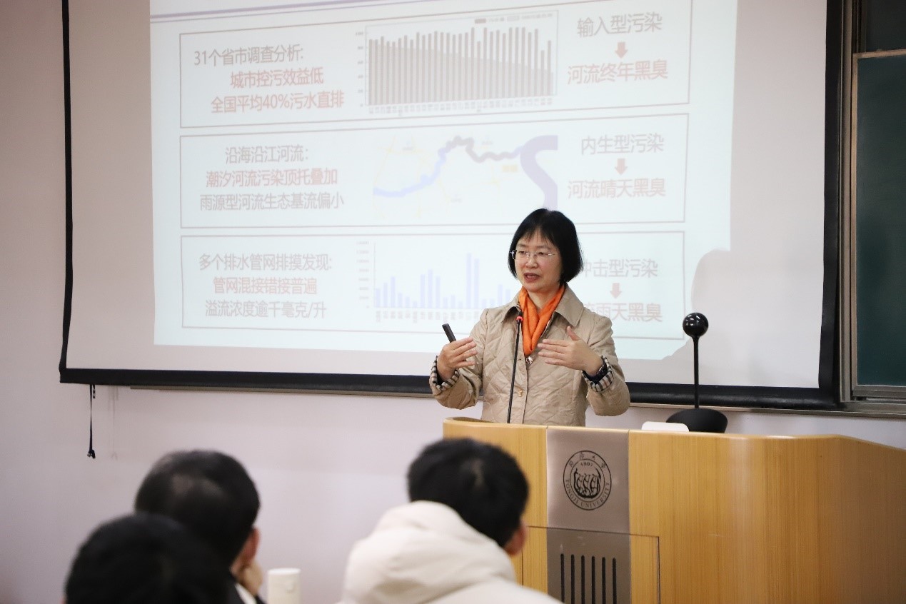 随后,徐祖信院士进一步介绍了城镇水环境治理所面临的挑战,详细分析了黑臭水体治理、管网完善、水源保护、环境监管执法及农村、工业、航运废水治理等方面存在的问题,为学生指明了未来学科领域的发展方向。她希望环境专业研究生们不仅要看到过往成就,更应当对目前中国水环境问题与挑战建立清晰的认知,并找到未来为之奋斗的科研目标。