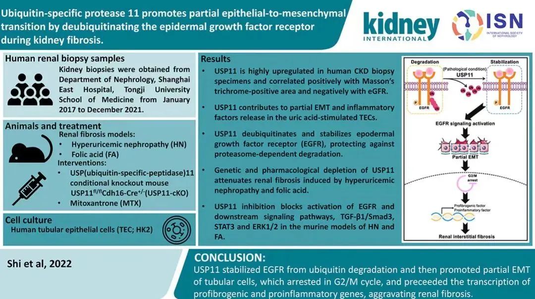 近日,同济大学附属东方医院刘娜教授团队在《国际肾脏期刊》(Kidney International)在线发表题为“Ubiquitin-specific protease 11 promotes partial epithelial-to-mesenchymal transition by deubiquitinating the epidermal growth factor receptor during kidney fibrosis”的研究论文。该研究证实泛素特异性蛋白酶11(USP11)与尿酸性肾病诱导的肾脏纤维化密切相关,是延缓尿酸性肾病患者肾功能进展的一个潜在治疗靶点。