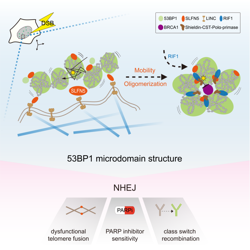 该研究探索了53BP1在DNA断端高阶拓扑排列的关键因素,并提出53BP1-MD高阶结构的塑造需要SLFN5介导的两个过程:(1) 由SLFN5-LINC-微管轴驱动的染色质运动, (2) 由SLFN5调控的53BP1寡聚体的组装。总之,这项研究确立了SLFN5是联系DNA断端染色质动态变化和拓扑重排的关键调节器,并提出染色质动态变化塑造高阶DNA修复拓扑结构的调控模型。