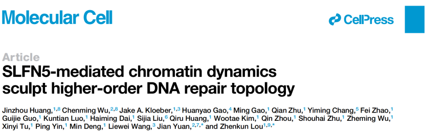 2月27日,同济大学医学院袁健教授团队联合美国梅奥医学中心楼振昆团队,在《分子细胞》(Molecular Cell)杂志在线发表了题为“SLFN5-mediated chromatin dynamics sculpt higher-order DNA repair topology”的文章。黄金舟博士和同济的吴晨明博士作为共同第一作者。