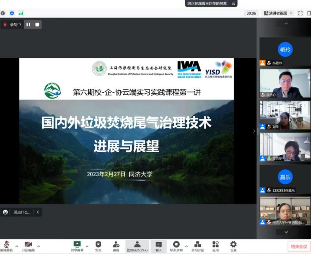 “校-企-协”云端实习实践课程是由同济大学牵头建设的上海市环境与生态高峰学科创新创业人才培养团队创建,从2020年至今已举办六期68讲。该课程面向全国高校环境学子和环保企业,采用“腾讯会议直播+超星学习通回看”的方式,旨在为后疫情期间高校学子暑期认知实践以及生产实习或毕业实习提供良好平台。
