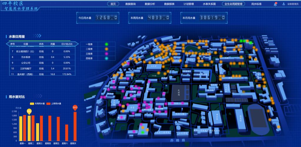 同济大学能源管理中心从节约每一滴水入手,加强节水管理工作,积极参加上海市计划用水办举行的“节水宣传周活动”学校对供水用水设施、设备和器具的管理和维护、保养工作。利用信息化和大数据分析等技术,对学校内主要的用水点进行在线监测与动态化管理,实现实时监控用水、及时异常报警、智能数据分析、统一报表管理、在线计量率监测、手机端便捷操作等功能,辅助管理决策,及时发现异常用水和浪费水的行为,有效挖掘单位节水改造的潜力。四平路校区自2022年下半年利用新建智慧水务系统发现用水异常11处,采取措施后,经统计每年可节约用水约29万吨,折合水费约127万元,产生了巨大经济效益。