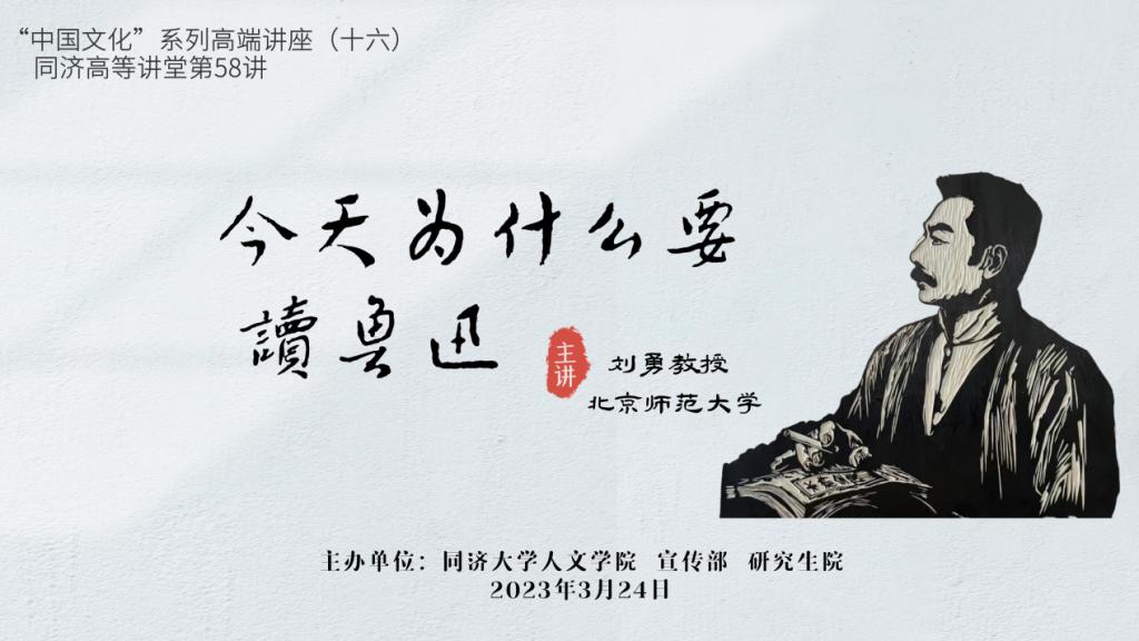 3月24日,同济大学“中国文化”系列高端讲座第十六讲暨同济高等讲堂第58讲在线举行,北京师范大学文学院刘勇教授为我校师生带来了“今天为什么要读鲁迅”的专题讲座。我校约300名师生全程聆听了讲座。