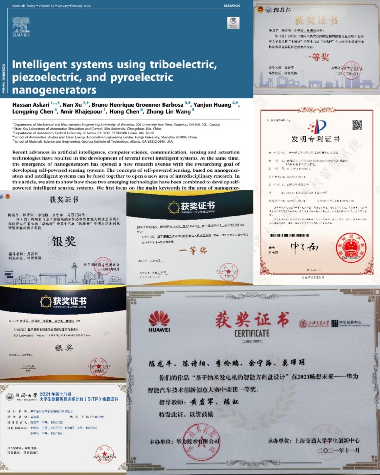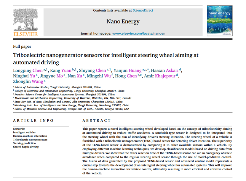 近日,汽车学院2019级本科生陈龙平以第一作者身份,在能源材料领域高水平期刊《纳米能源》(Nano Energy)发表了题为“Triboelectric nanogenerator sensors for intelligent steering wheel aiming at automated driving”的研究论文。该论文是同济大学大学生创新项目的代表性成果,是车辆工程、智能科学与技术等多学科交叉融合的体现,也是校企产学研合作的结晶。其指导老师陈虹教授和黄岩军教授为论文共同通讯作者。