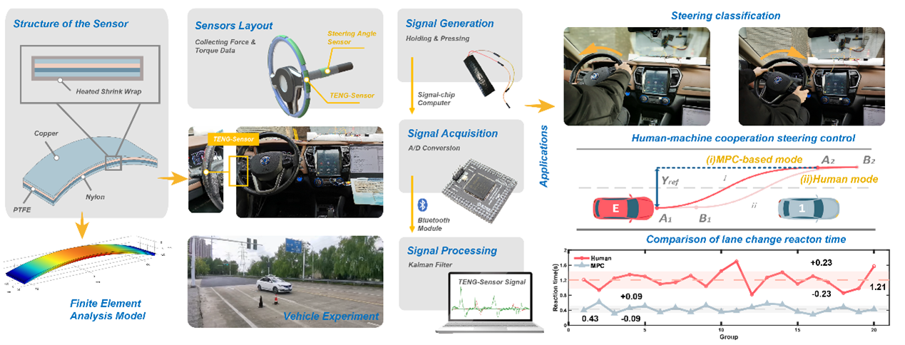 近年来,人工智能、传感方法、通信技术和控制理论的进步加速了自动驾驶车辆的发展。人机交互系统(HMI)是智能汽车的重要组成部分,是人与车之间的重要纽带。HMI的存在能够增强驾驶体验,同时监测驾驶员行为。为了分析驾驶状态,系统需要获取有关环境和驾驶员的信息,因此传感器发挥着至关重要的作用。然而,摄像头和可穿戴设备存在的稳定性、准确性缺陷及对电源的需求限制了传统传感设备的发展,摩擦电纳米传感器(TENG)凭借高灵敏性、小体积、自供电特性应运而生。研究创造性地提出将TENG用于人机交互的首要界面——方向盘上,以期为自动驾驶车辆中HMI系统提供一种紧凑、高效和自供电的解决方案。该研究依托于科技部科技创新2030——“新一代人工智能”重大项目《开放环境下安全可信的人机共驾系统》等项目。