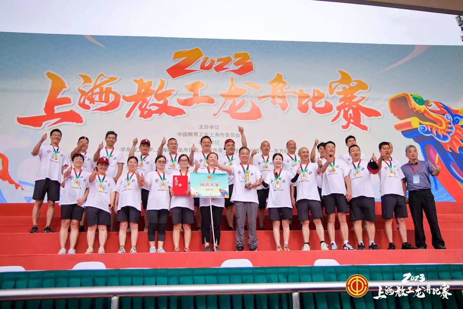 6月11日,由中国教育工会上海市委员会主办的2023年上海教工龙舟比赛举行,来自各高校、区教育局、直属单位、市教卫工作党委、市教委机关和市中职联工会的31支代表队的800余名选手参赛。我校教工龙舟队以55秒60的成绩蝉联上海市教工龙舟比赛高校A组冠军。