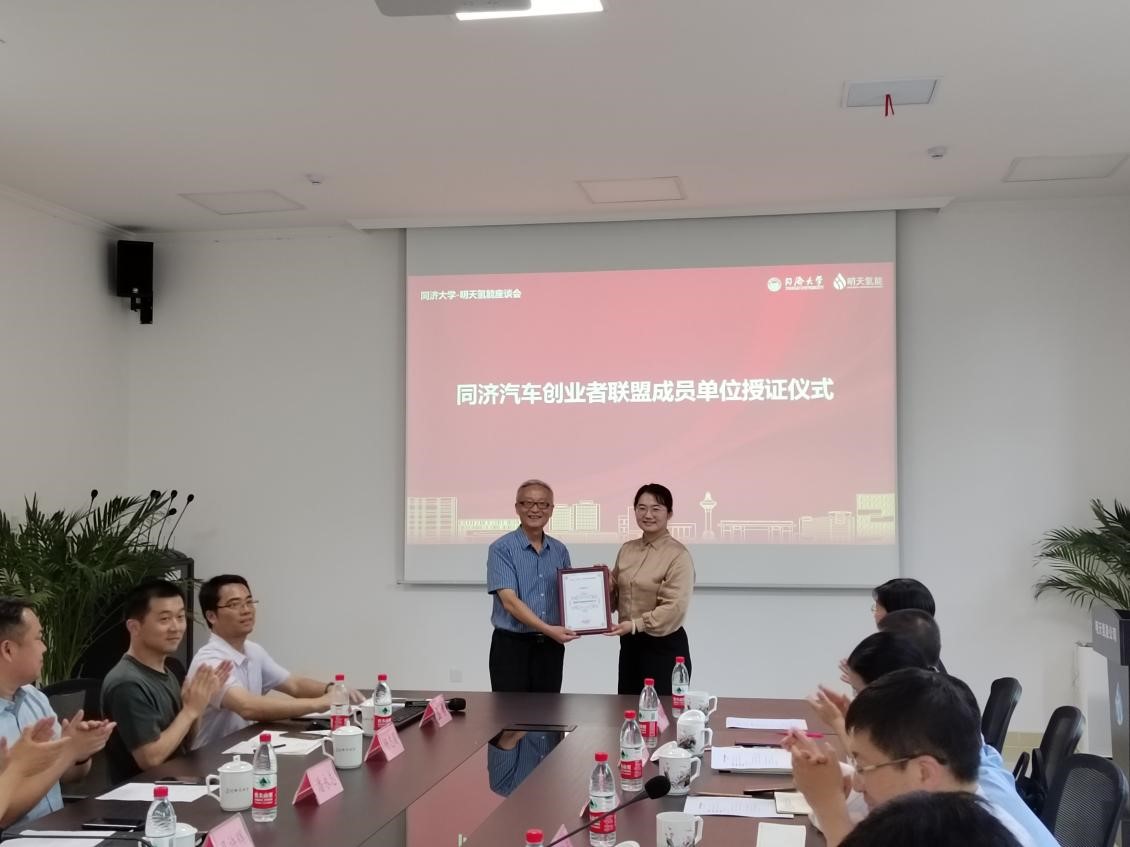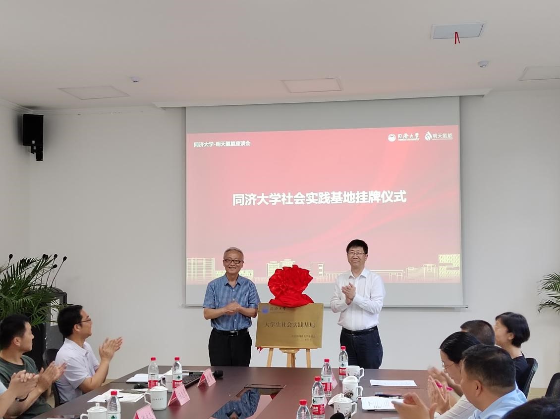 随后,彭震伟一行赴六安当地的校友企业明天氢能科技股份有限公司调研,并看望社会实践团学生。明天氢能科技股份有限公司董事长、同济大学1984届校友王朝云等与彭震伟一行进行座谈交流,介绍了公司的发展情况。彭震伟对明天氢能公司为同济学子成长成才提供的实践平台表示感谢,期待校企双方推进更为广泛而深入的合作。座谈会上,同济大学社会实践基地挂牌仪式与同济汽车创业者联盟成员单位授证仪式举行。