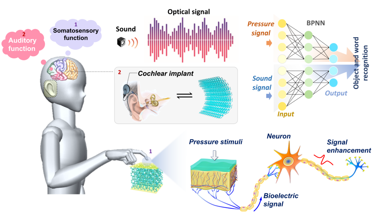 图1 、受人体体感和听觉功能的启发,双功能HOF-TTA@MF(1和2)可用于压力和听觉感知,1和2结合的双模传感器用于物体和词语信息识别
