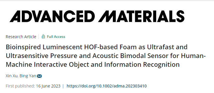 近日,我校化学科学与工程学院闫冰教授团队将仿生学思想巧妙融入有机框架材料合成与应用研究之中,制备出超快超灵敏的压力-声音双模光响应传感器,并将之应用于人机交互,实现了对物体和信息的识别,相关成果以“Bioinspired Luminescent HOF-based Foam as Ultrafast and Ultrasensitive Pressure and Acoustic Bimodal Sensor for Human-Machine Interactive Object and Information Recognition”为题在线发表于化学、材料高水平期刊《先进材料》(Advanced Materials)上。