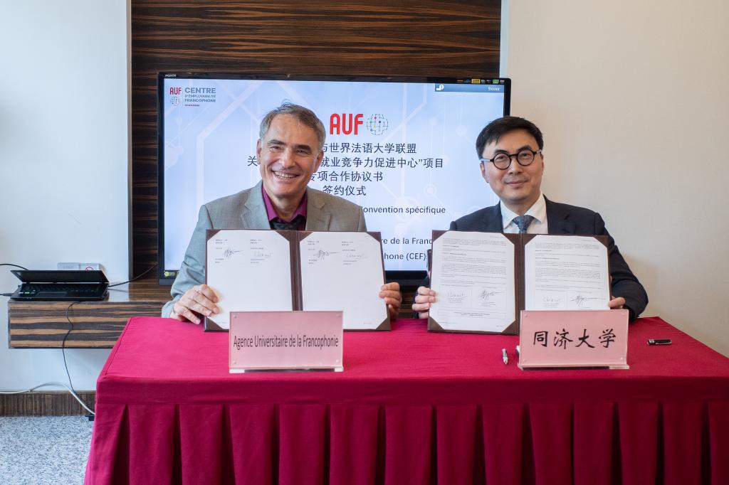 随后,娄永琪和洛朗·塞尔梅特签署了同济大学和世界法语大学联盟关于“法语就业竞争力促进中心”项目专项合作协议书。该项目致力于提升法语世界高校毕业生的就业率和质量,并进一步加强AUF亚太区各校之间的互动交流与合作网络建设。