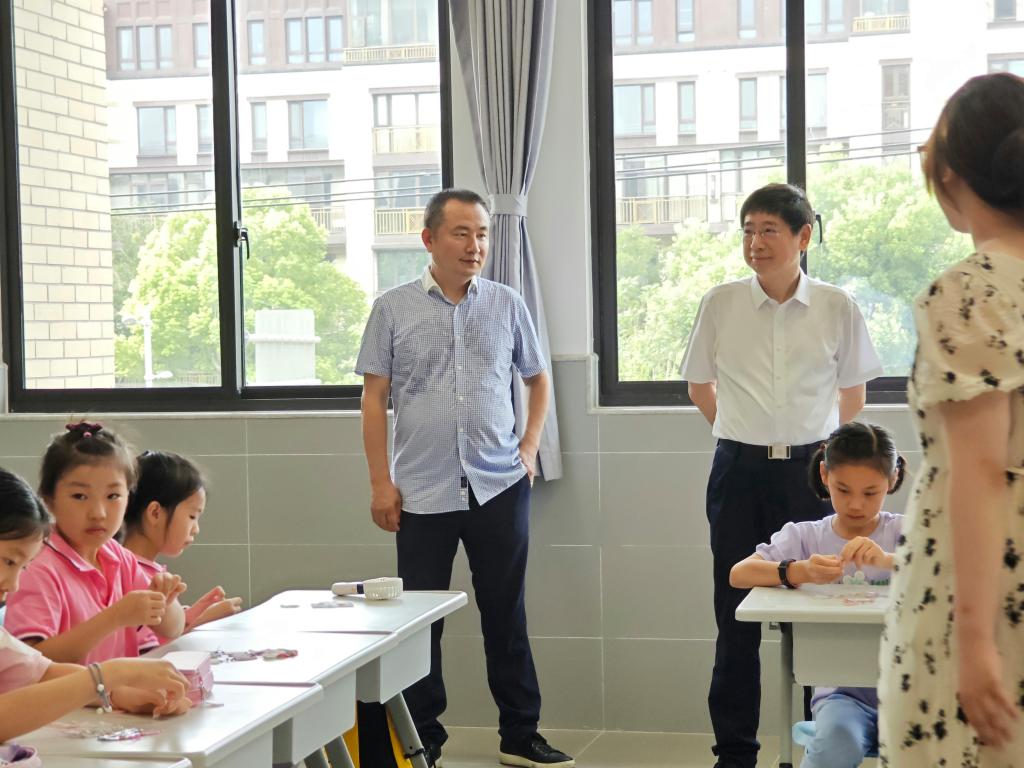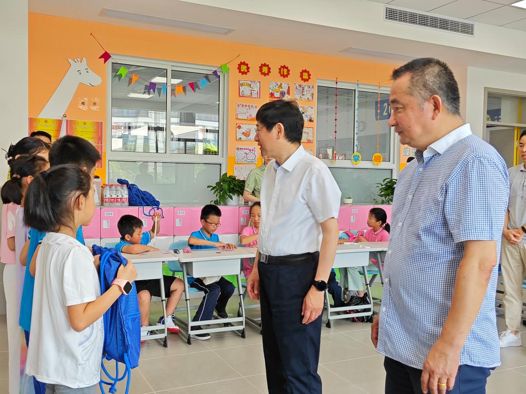 7月13日上午,校党委副书记、工会主席吴广明实地走访附属新江湾城实验学校,就作为学校2023年“我为师生办实事”项目之一的“同二代”无忧暑托班活动进行调研。附属新江湾城实验学校、校工会、基础教育办公室负责人陪同调研。