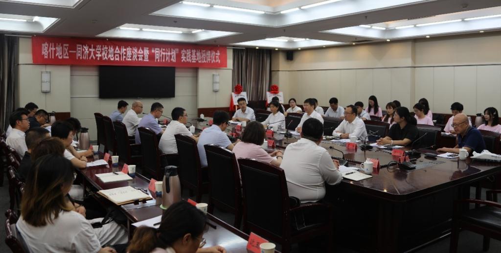 7月30日上午,喀什地区—同济大学校地合作座谈会暨“同行计划”实践基地授牌仪式在喀什举行。喀什地委委员、组织部部长周云华,组织部常务副部长王旭东,部务委员李诚洲及各实践单位负责人,同济大学党委副书记彭震伟,党委学研工部、校团委、学生就业指导中心、汽车学院相关负责人及“同行计划”新疆实践团指导老师出席会议。